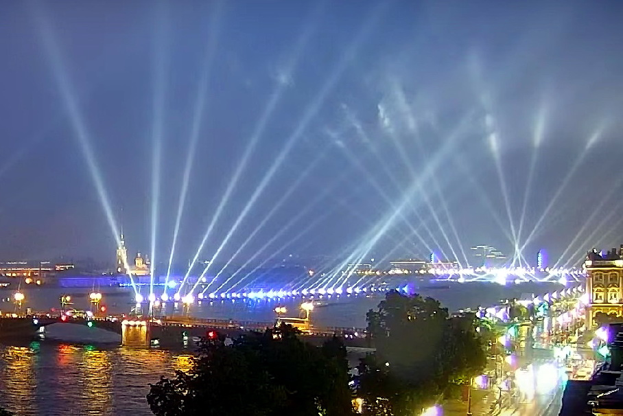 До «Алых парусов» — праздника петербургских выпускников — осталось чуть менее двух суток, приготовления к шоу на воде идут полным ходом. Благодаря супервидовым веб-камерам любой желающий может увидеть, как на тьму над Невой в ночь на 23 июня разрезают лучи прожекторов.
