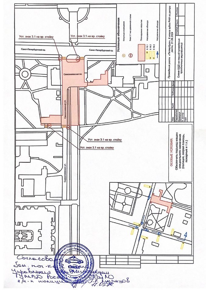 - с 07:00 до 13:30 — в Дворцовом проезде, на набережной канала Грибоедова от Ново-Конюшенного моста до Невского проспекта, а также на Невском проспекте от Дворцовой площади до набережной канала Грибоедова;
