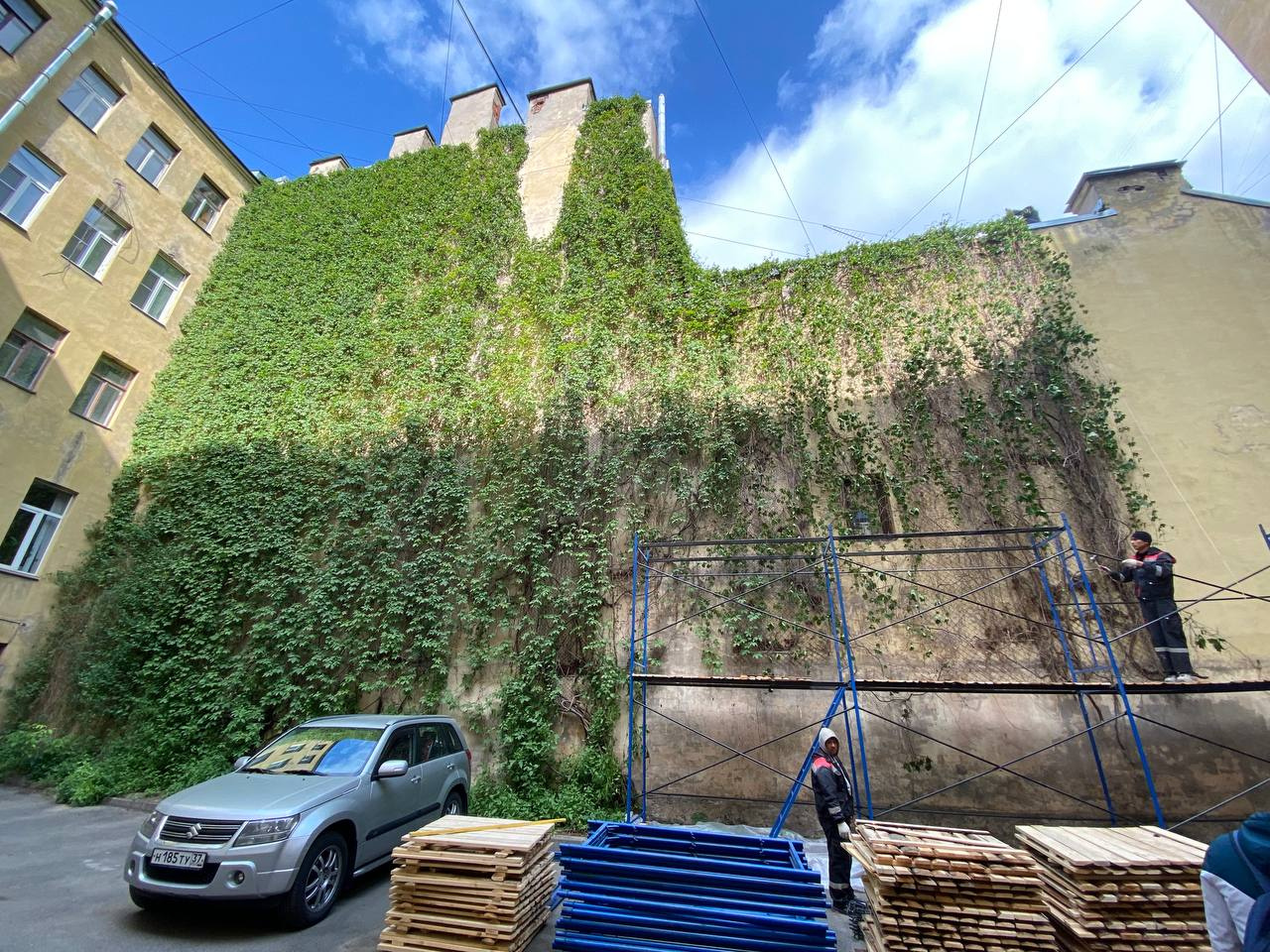 Реставрационные работы вызвали переполох среди жильцов дома 2 в Виленском переулке. Петербуржцы привыкли, что десятки лет на брандмауэрной стене соседнего здания висит виноградник, а сейчас он оказался под угрозой вырубки. Своей тревогой они 1 июня поделились с редакцией.