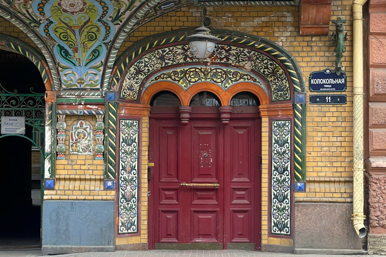 И даже во внешнем виде входной группы чувствуется эта «русскость»: мало того, что стены возле двери украшают изразцы, так еще и над дверью висят типичные для этого стиля гирьки. А еще это, пожалуй, единственный адрес в Петербурге, где номер дома указан на потолке!