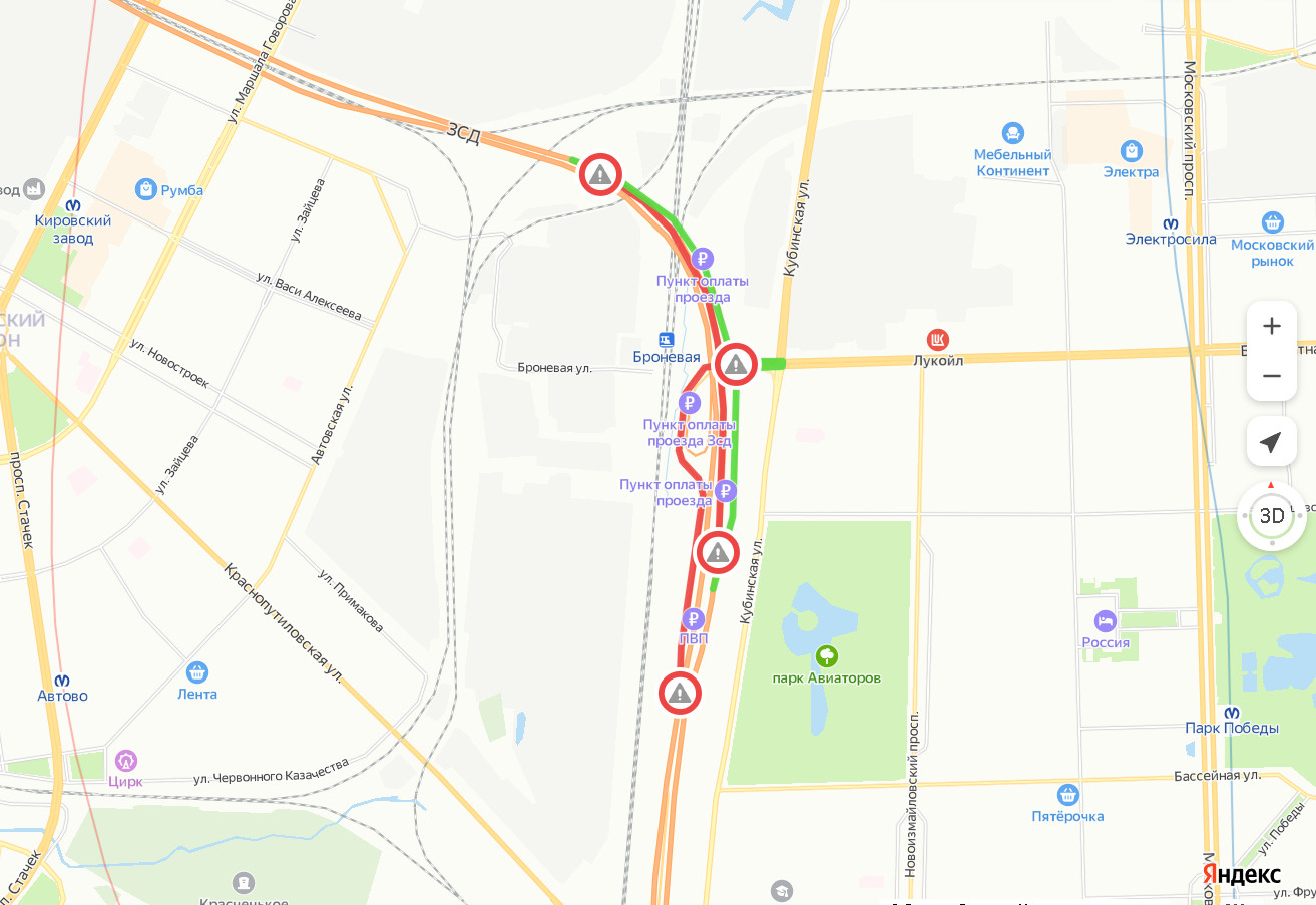 При этом въезд с Благодатной улицы на ЗСД в сторону северной развязки с КАД и съезды с ЗСД на Благодатную будут работать в штатном режиме. И также без каких-либо ограничений можно будет проехать по основному ходу в южном направлении. При движении с юга можно будет съехать с ЗСД на Благодатную, развернуться на перекрестке съезда ЗСД, Благодатной и Кубинской улиц и заехать на магистраль в северном направлении.