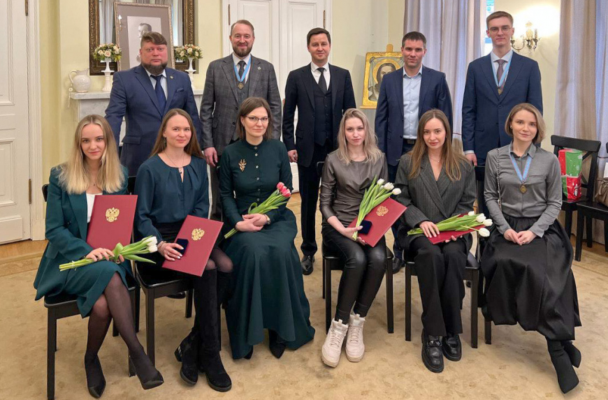Учредитель Фонда Илья Яковлев вручил медали «За активную гражданскую позицию и патриотизм» Виктору Соколову, Ксении Меркушевой, Ксении Барабановой – региональным представителям НЭС СФ РФ, Татьяне Деринг – советнику заместителя председателя НЭС СФ РФ и Дарье Чумак – главному специалисту отдела кадров АО «НИИ КП».