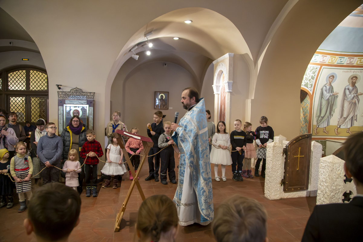 Отец Александр объяснил, что во главе собрания христиан находится Христос, все люди — Его ученики, и собираются вместе, чтобы благодарить Бога за все, что Он даровал. Дети следом за ним произнесли слова благодарности: «Благодарим Тебя, Господи, за все, что Ты сделал для нас, за то, что сотворил весь мир, небо и землю, солнце, луну и звезды, за то, что создал нас по Своему образу и подобию, за то, что Ты не оставил нас, когда мы согрешили, благодарим Тебя за Сына Твоего Иисуса Христа — Он наш Господь Спаситель, Царь и Повелитель, Он наш высший Судия и будет судить нас по делам нашим, Он призвал нас в Церковь Свою, чтобы мы были Его учениками, за все это мы благодарим Тебя, Отца Небесного, и вместе с херувимами и серафимами непрестанно хвалим».