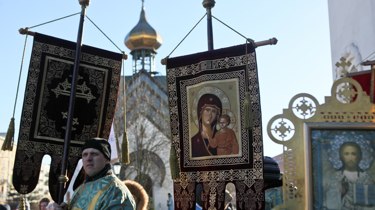 Участники крестного хода начали шествие у Свято-Троицкого собора Александро-Невской Лавры днем в понедельник.