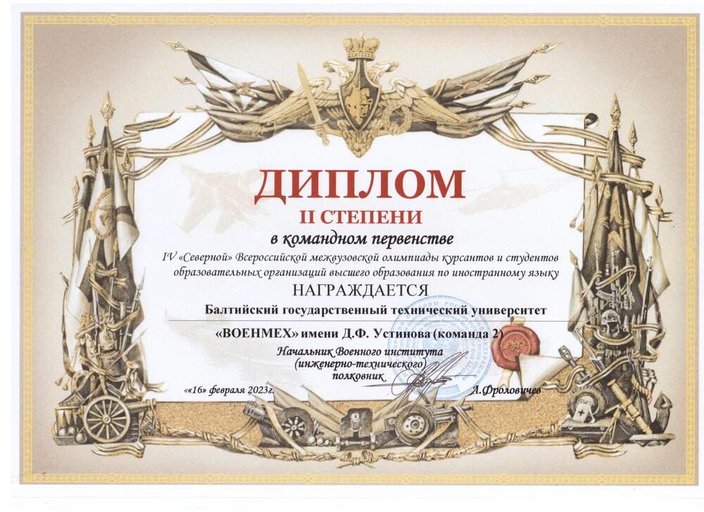 На этой неделе состоялось награждение победителей и призеров IV "Северной" Всероссийской межвузовской олимпиады курсантов и студентов образовательных организаций высшего образования по иностранному языку. Олимпиада была организована Военным институтом (инженерно-техническим) Военной академии материально-технического обеспечения им. генерала армии А.В. Хрулева. Олимпийская команда БГТУ «Военмех» им. Д.Ф. Устинова завоевала второе место в командном первенстве английскому языку. Вот имена наших достойных студентов:
