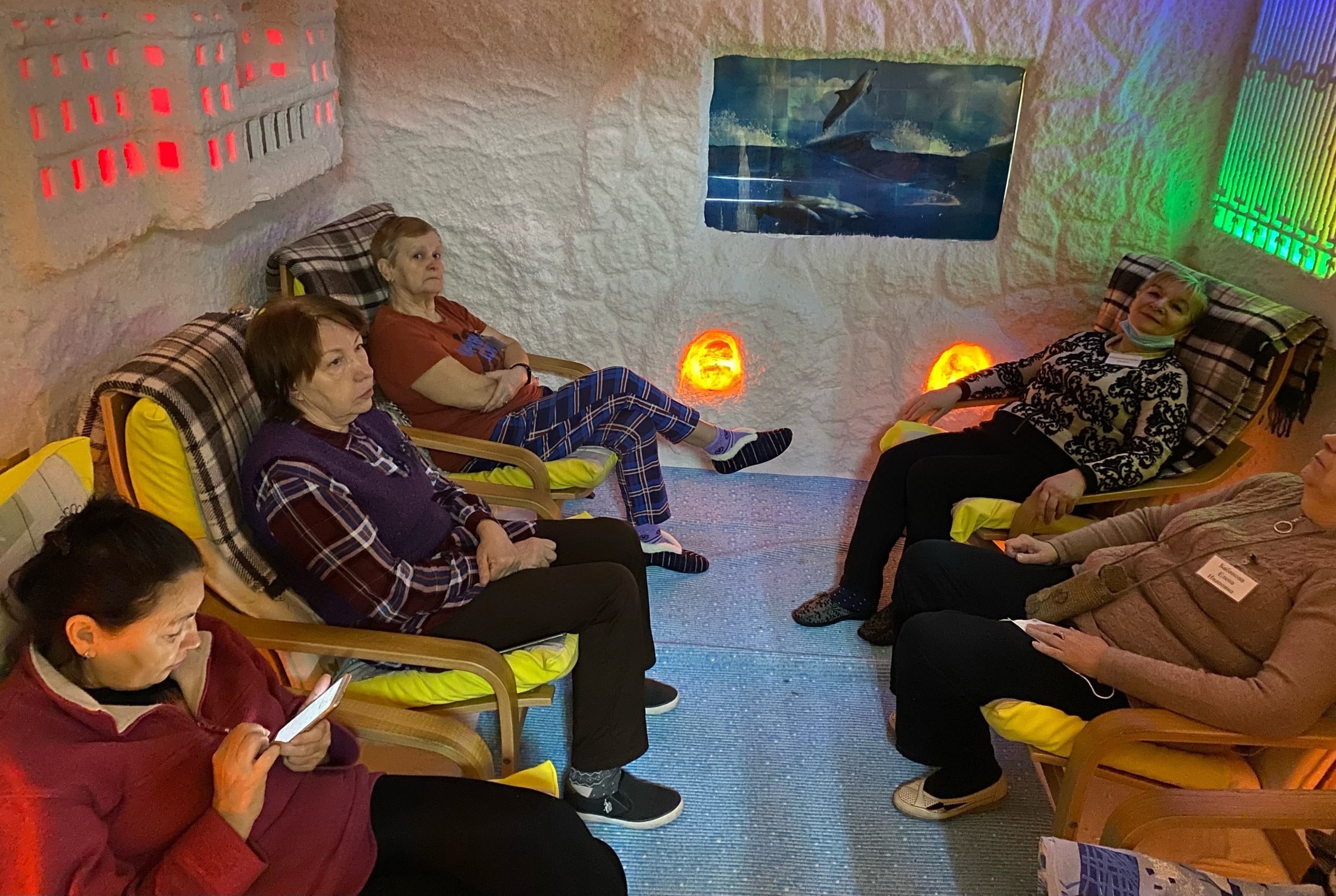 Стены кабинета галотерапии покрыты солевыми блоками, которые необходимы для поддержания режима влажности и температуры, а так же создают впечатление натуральной «пещерной» атмосферы. Для максимальной релаксации в кабинете приглушенное освещение, тихая расслабляющая музыка или звуки природы. Уютно устроившись в кресле, можно укрыть колени согревающим пледом.