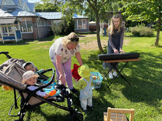 Музыкальный руководитель вместе с воспитателями проводят музыкальные занятия на любимых полянках. Знакомые персонажи радуют малышей своим появлением, веселые песенки побуждают к плясовым движениям. Жаркая погода способствует закаливанию, выработке витамина Д и, просто, созданию радостного настроения, подвижные игры под музыкальное сопровождение развивают слуховое восприятие, и основные движения малышей.