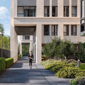 Вход во двор организован через парадную входную группу с витражными окнами, высокими потолками и зоной ресепшен.