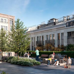 Двор утопает в зелени и предназначен только для отдыха, машины только в подземном паркинге (на лифте можно спуститься с каждого этажа) и на гостевой стоянке. Уникальная особенность двора — «зеленая комната», оазис, образованный зеленым массивом вокруг скамеечек. Для детей во дворе будет необычный игровой комплекс - деревянный лабиринт, для подростков - спортивная площадка. Во втором корпусе появится коворкинг для жителей.