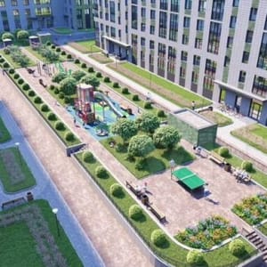 — Игровая зона с детскими и спортивными площадками, выполнено безопасное покрытие